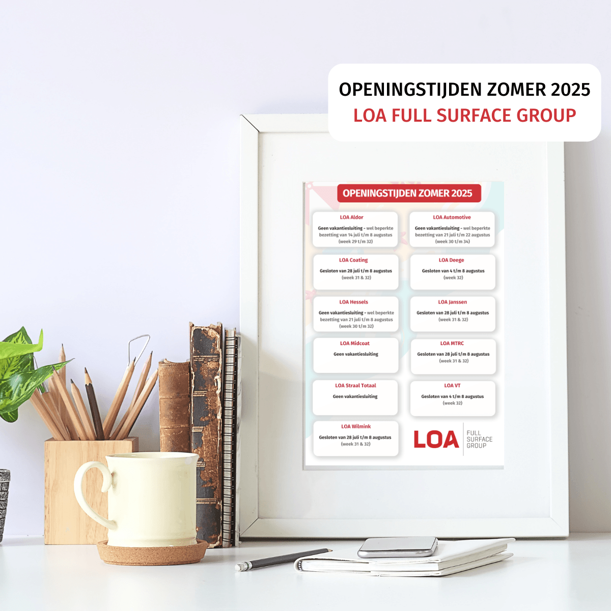 In de zomer van 2025 gelden voor onze vestigingen andere openingstijden dan u gewend bent. In het overzicht ziet u welke vestigingen u kunt benaderen met vragen, opdrachten of andere bijzonderheden. Neem gerust contact met ons op, wij staan u graag te woord!