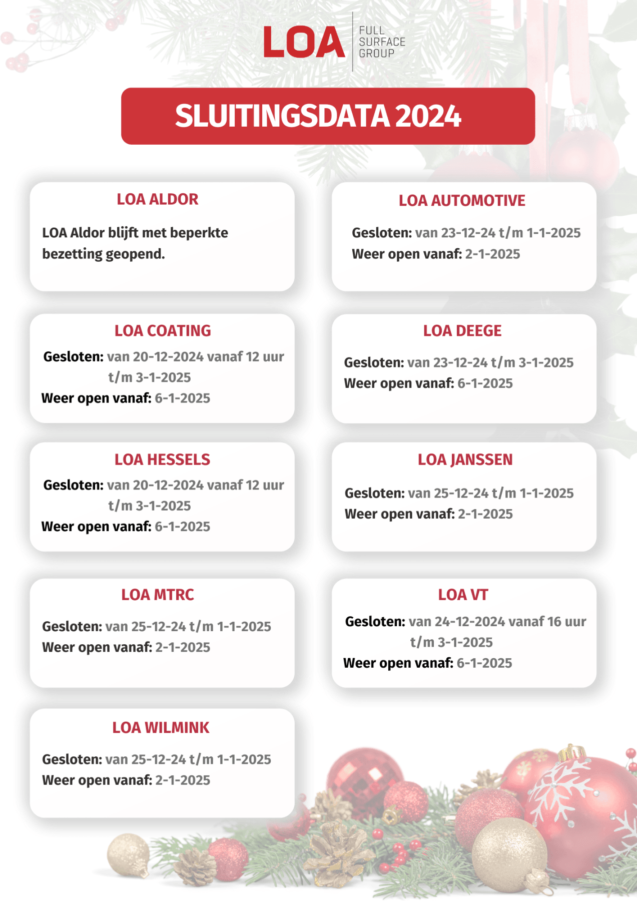 In de laatste week van het jaar gelden voor onze vestigingen andere openingstijden dan u gewend bent. In het overzicht ziet u welke vestigingen u rondom de feestdagen kunt benaderen met vragen, opdrachten of andere bijzonderheden. Neem gerust contact met ons op, wij staan u graag te woord.